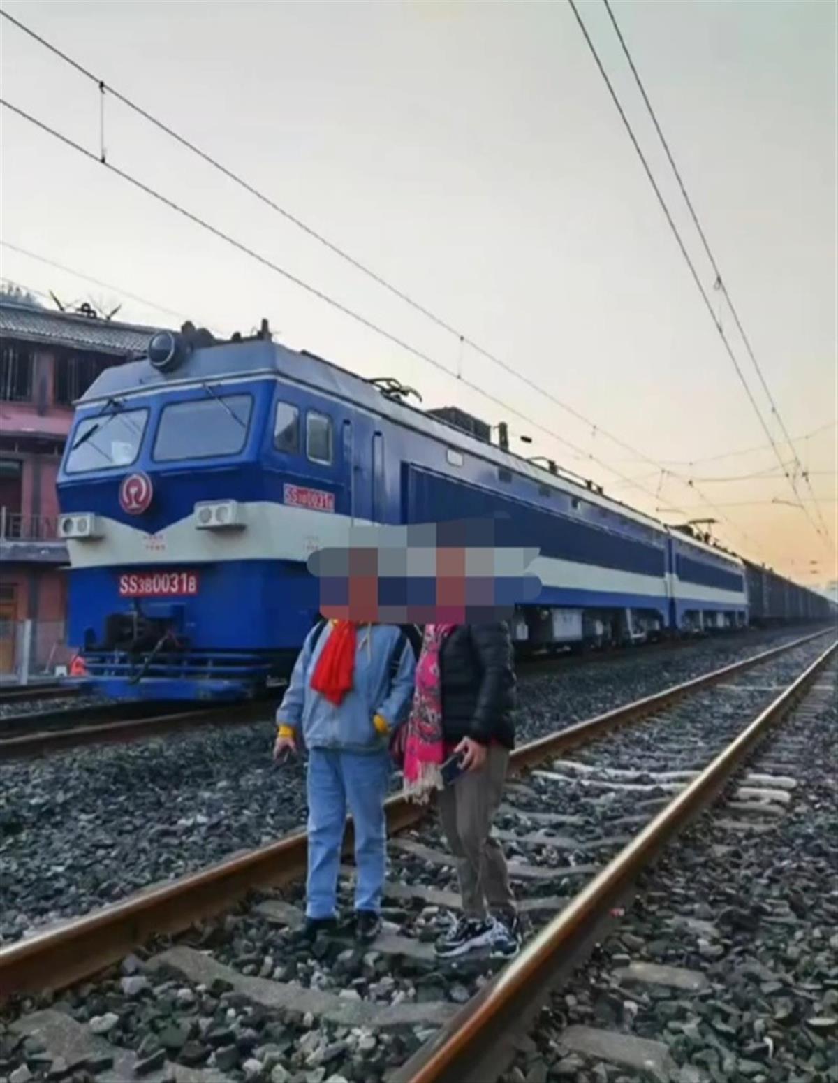 近日,网友发布多名中老年人进入铁路轨道拍照的视频,引发关注。视频中,几人曾在围栏内朝迎面驶来的火车招手,还牵手走在铁轨处。