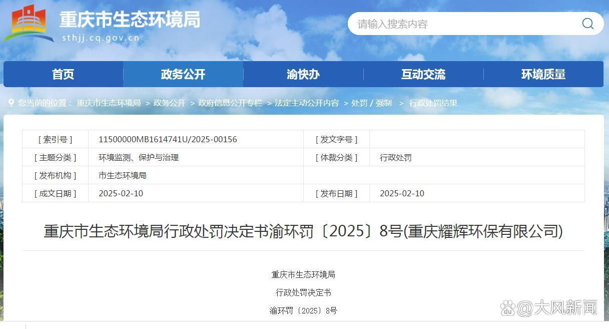 重庆市生态环境局认为,重庆耀辉两年内曾受到生态环境行政处罚,属于再犯;且该单位此次违法行为属于逃避监管方式排放污染物,定级为较大突发环境事件,依法应予从重处罚。2025年2月6日,该局对重庆耀辉罚款100万元。
