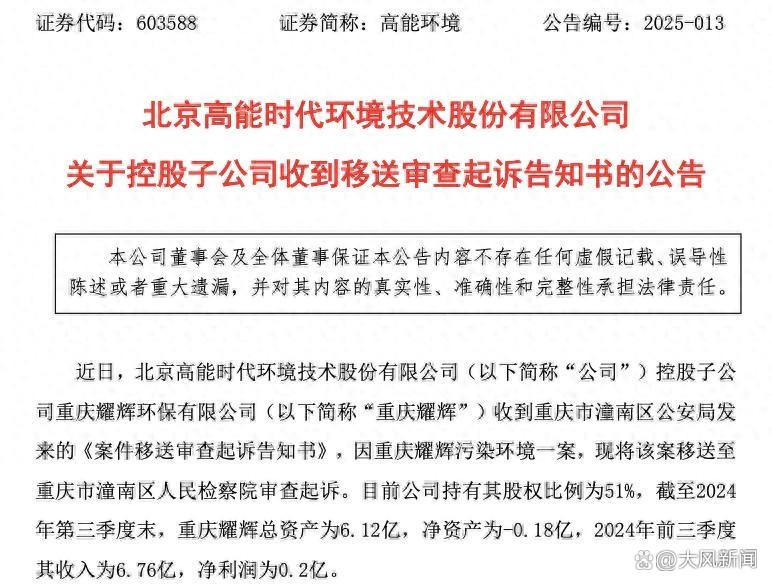 今年3月10日,北京高能时代环境技术股份有限公司(603588.SH)董事会,在上市公司层面披露“关于控股子公司收到移送审查起诉告知书的公告”。