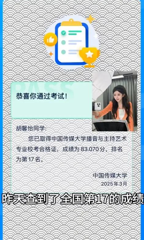 最终,其取得了中国传媒大学播音与主持艺术专业校考合格证,成绩83.070分,排名17名。