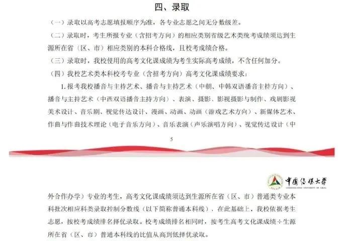 中国传媒大学招生处老师表示,艺考生校考合格后还要通过要求的高考分数线,之后会按照校考专业课的排名依次录取。“校招考试通过后不能算录取,还要看高考文化课成绩”。