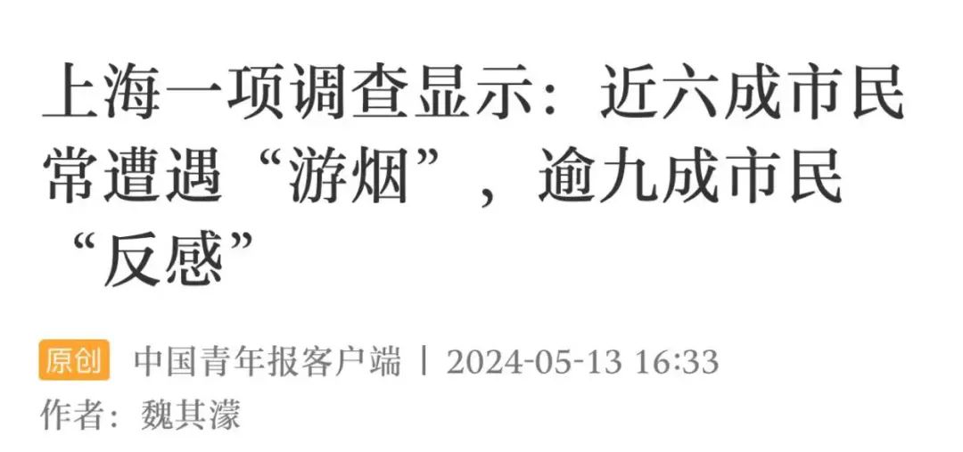 2024年,上海市开展了关于室外二手烟的抽样调查,结果显示10000名受访者中,近六成市民表示经常遭遇“游烟”,九成市民对“游烟”表示反感。