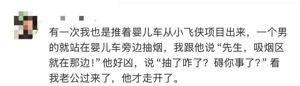 陈女士目击了整个事发经过。“那里是一个死角,很多人会在那里抽烟,已经从6点半持续到7点了。引发事端的这一位,他非常靠近婴儿车,一步之遥而已,家长说‘请你不要抽烟,我们孩子就在这里’,他就反问,‘你小孩有多金贵啊’。”