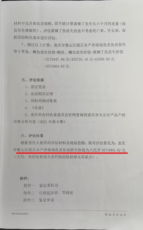 经评估,鲫鱼和草鱼流失重量约为33万斤、鲢鳙鱼4.5万斤、黄辣丁3000余斤,共计37万余斤,其中鲫鱼与草鱼流失价值约317万余元,鲢鳙鱼流失价值约35.6万余元,黄辣丁鱼流失价值约4.35万元,合计流失价值约357万余元。