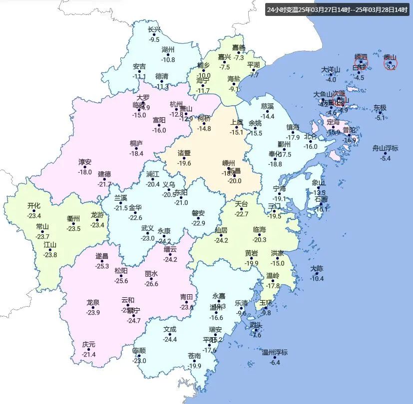最高气温与前一天相比,更是出现“坍塌式”降温。多地降温可达11-24℃,局地甚至超25℃。比如丽水,前天下午出现高温(36.4℃),并打破3月最高纪录,昨天却不到10℃,直降26.6℃,为14时全国降温最强站点,跨季式降温,一键从夏天回冬天。一直要冷到3月底,4月1日起我省以晴到多云为主,气温逐渐回升。