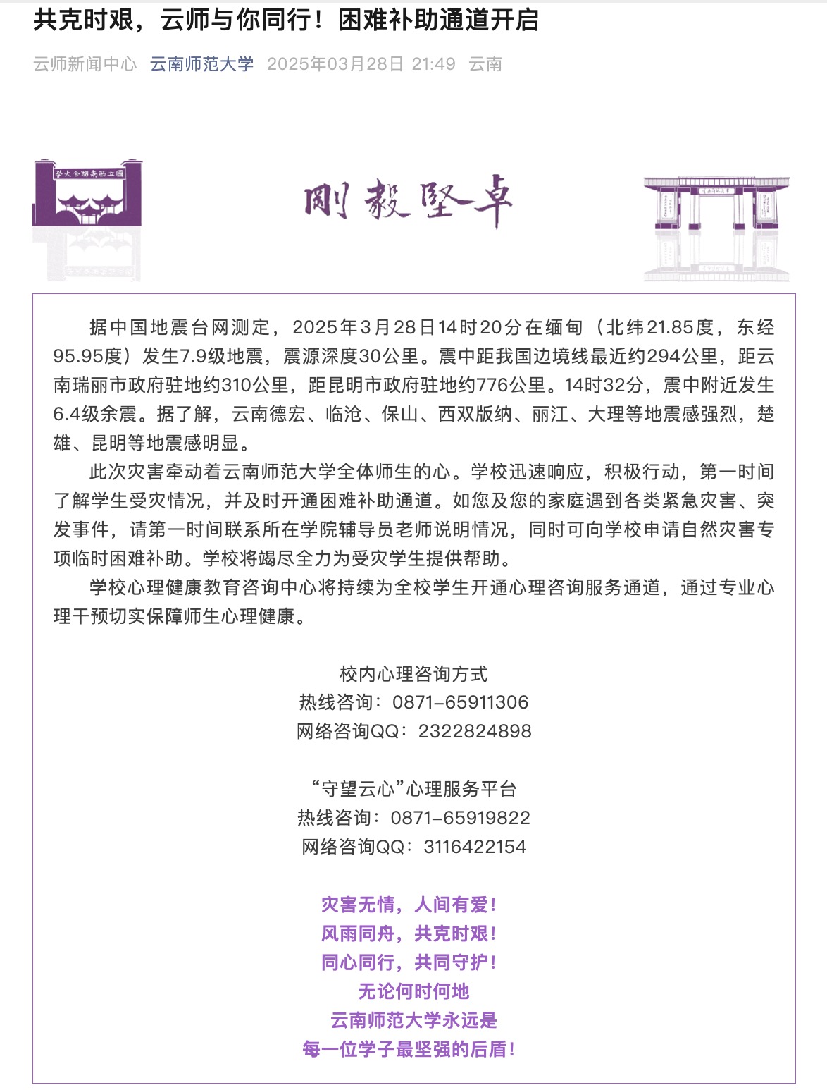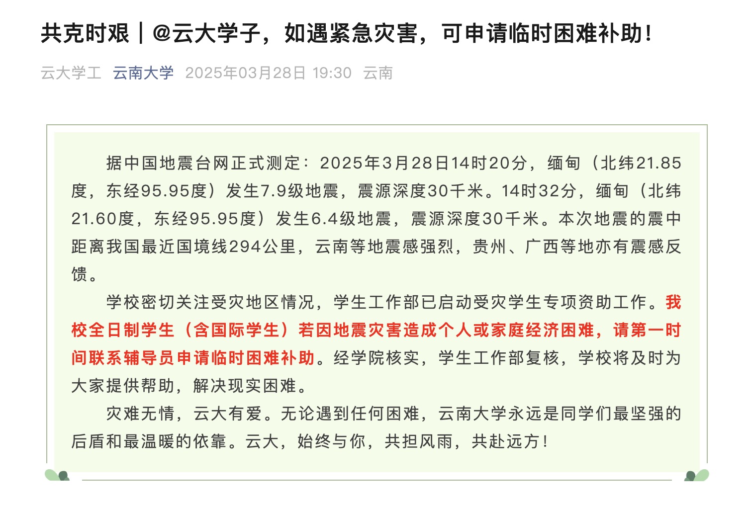 3月28日,缅甸发生7.9级地震。本次地震的震中距离我国最近国境线294公里,云南多地震感强烈。为帮助受地震影响的学生及其家庭渡过难关,云南大学和云南师范大学相继启动了地震受灾学生临时困难专项资助工作。