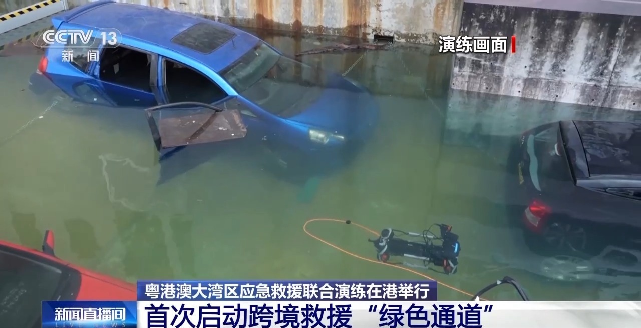 在地库停车场水浸事故科目现场,香港消防处首先派出水下机器人进行探测,再由潜水队员将落水车辆中的被困者成功营救后,广东省消防救援总队水域救援专业队的队员接着操作履带式排涝机器人,对车库展开排涝作业。