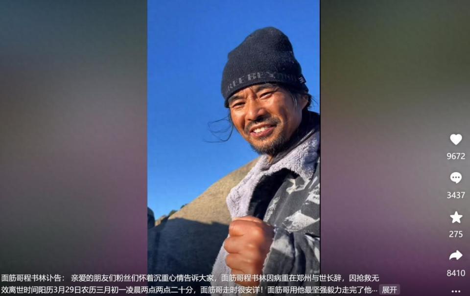 3月29日,网红 “面筋哥” 程书林的爱人通过个人账号发布讣告,宣布面筋哥程书林因病重,于今日凌晨两点二十分在郑州抢救无效离世。消息传来,众多网友纷纷表示哀悼与惋惜。