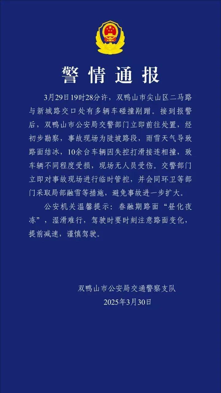双鸭山路面结冰,10余台车辆因失控打滑相撞,警方通报:无人员受伤