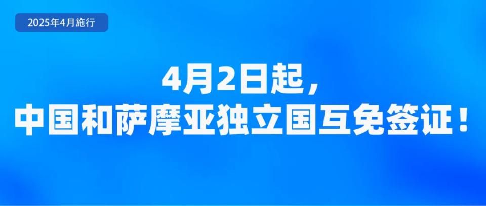 《中华人民共和国政府和萨摩亚独立国政府关于互免签证的协定》于2025年4月2日起生效。根据协定,持有效的中国外交、公务、公务普通及普通护照和持有效的萨摩亚独立国外交、官员及普通护照公民,在缔约另一方入境、出境或者过境,单次停留不超过30日,每180日累计停留不超过90日,免办签证。如需在缔约另一方境内停留超过上述停留期限,或在缔约另一方境内从事工作、学习、定居、新闻报道等须经缔约另一方主管部门事先批准的活动,应当在入境缔约另一方前申请相应签证。