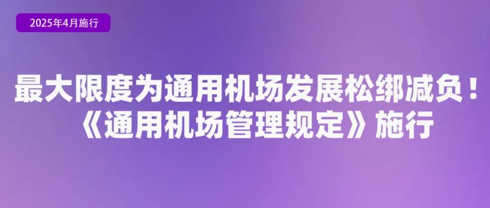 交通运输部印发公布《通用机场管理规定》(交通运输部令2024年第11号),进一步健全了通用机场管理制度体系,规范了通用机场建设、使用许可及备案、运营等各个阶段行业管理要求。《规定》以确保通用机场运行安全为根本前提,以节约投资和降低运行成本为总体思路,并遵循以下原则:一是放管结合、以放为主,能放开的坚决放开,能取消的尽量取消,最大限度为通用机场发展松绑减负;二是分类分级管理,在《通用机场分类管理办法》的基础上,进一步调整优化分类分级方式。三是将建设管理和使用许可及运营管理分离。本规定自2025年4月1日起施行。
