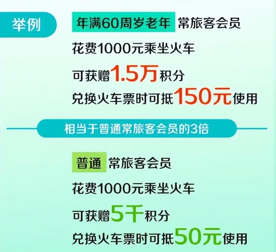 4月1日起,国铁集团在现行“铁路畅行”常旅客会员服务基础上,对年满60周岁持居民身份证、港澳居民居住证、台湾居民居住证、港澳居民来往内地通行证、台湾居民来往大陆通行证、外国人永久居留身份证的老年常旅客会员实施更大幅度的积分优惠,积分可兑换火车票,将更好地满足老年旅客对美好旅行生活的向往,为促进银发经济发展、扩大服务消费注入新动能。