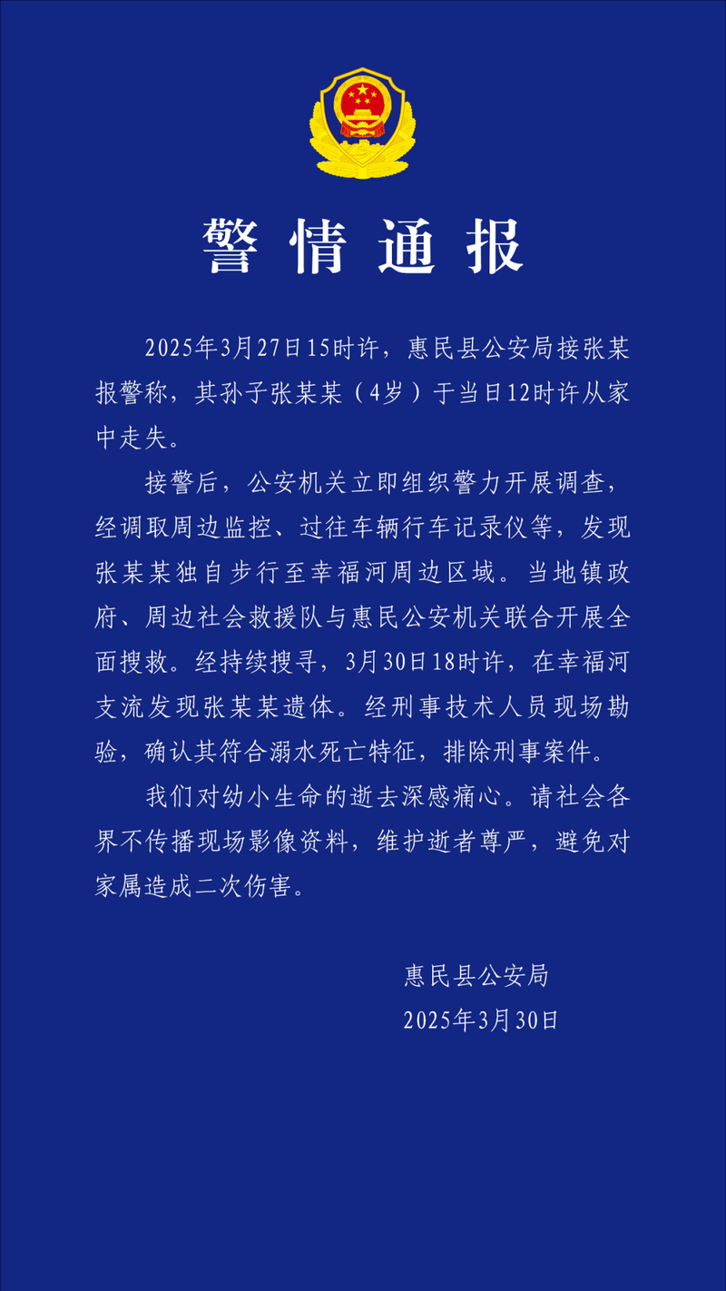 山东惠民县警方通报“4岁男童走失”:确认溺亡,排除刑事案件
