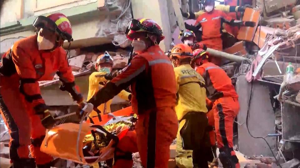 ▲当地时间3月31日7点15分左右,中国救援队再次在曼德勒市天空公寓救援点搜救出一名幸存者。(视频截图)