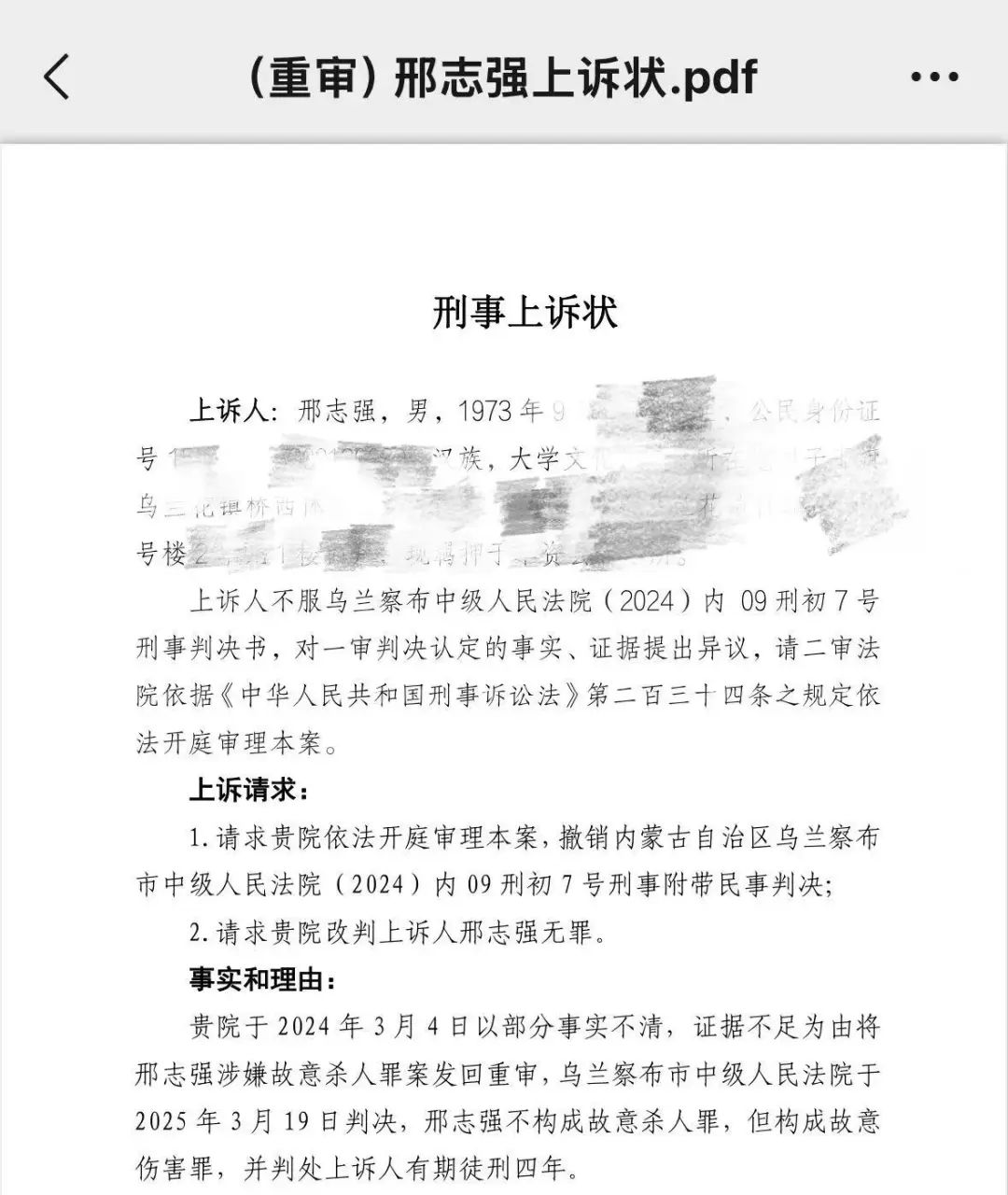 被告人邢志强提交的上诉状 图源:被告人邢志强辩护律师提供