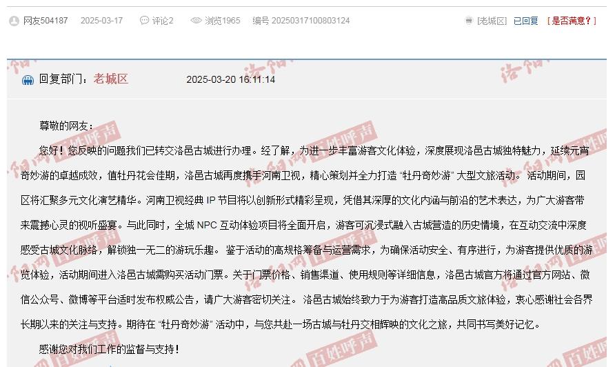 您好!您反映的问题我们已转交洛邑古城进行办理。经了解,为进一步丰富游客文化体验,深度展现洛邑古城独特魅力,延续元宵奇妙游的卓越成效,值牡丹花会佳期,洛邑古城再度携手河南卫视,精心策划并全力打造 “牡丹奇妙游” 大型文旅活动。活动期间,园区将汇聚多元文化演艺精华。河南卫视经典IP节目将以创新形式精彩呈现,凭借其深厚的文化内涵与前沿的艺术表达,为广大游客带来震撼心灵的视听盛宴。与此同时,全城NPC互动体验项目将全面开启,游客可沉浸式融入古城营造的历史情境,在互动交流中深度感受古城文化脉络,解锁独一无二的游玩乐趣。