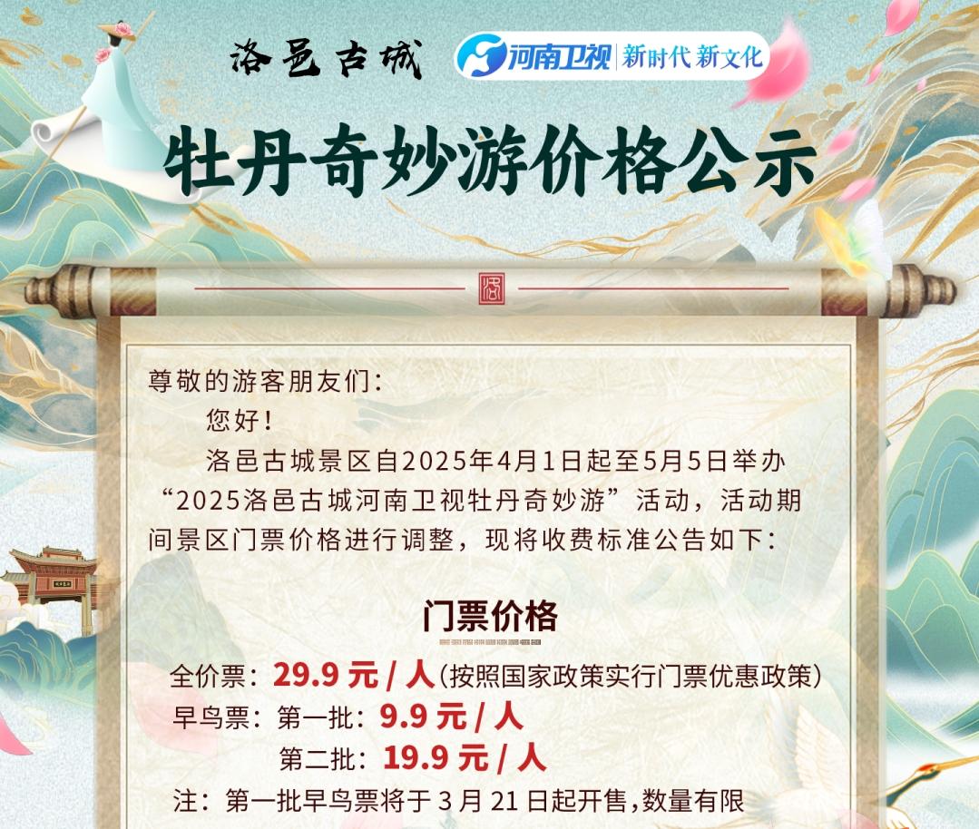 鉴于活动的高规格筹备与运营需求,为确保活动安全、有序进行,为游客提供优质的游览体验,活动期间进入洛邑古城需购买活动门票。关于门票价格、销售渠道、使用规则等详细信息,洛邑古城官方将通过官方网站、微信公众号、微博等平台适时发布权威公告,请广大游客密切关注。洛邑古城始终致力于为游客打造高品质文旅体验,衷心感谢社会各界长期以来的关注与支持。期待在 “牡丹奇妙游” 活动中,与您共赴一场古城与牡丹交相辉映的文化之旅,共同书写美好记忆。