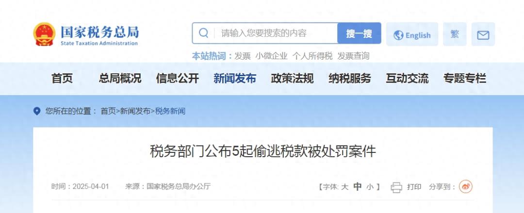 据国家税务总局网站消息,4月1日,税务部门公布5起偷逃税款被处罚案件。