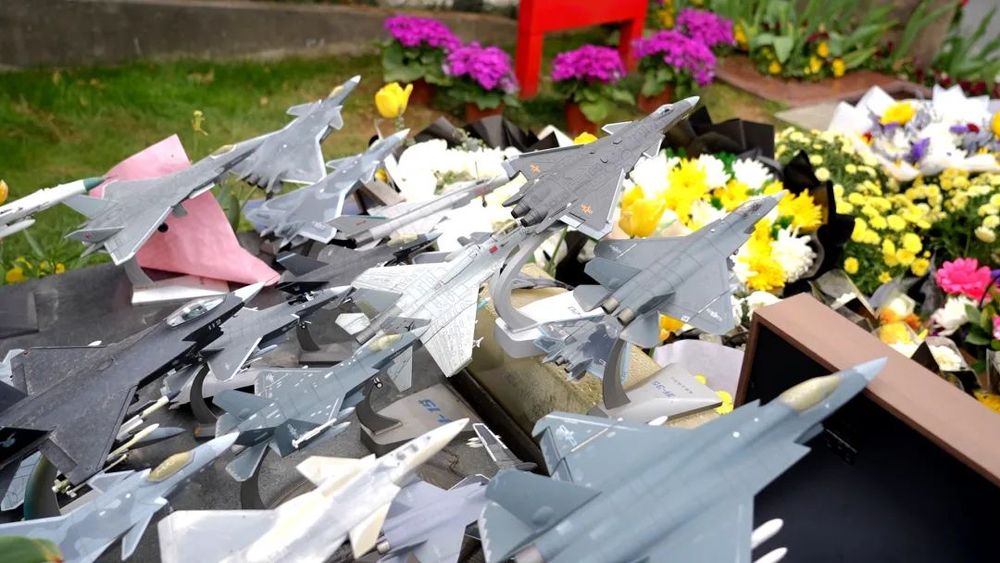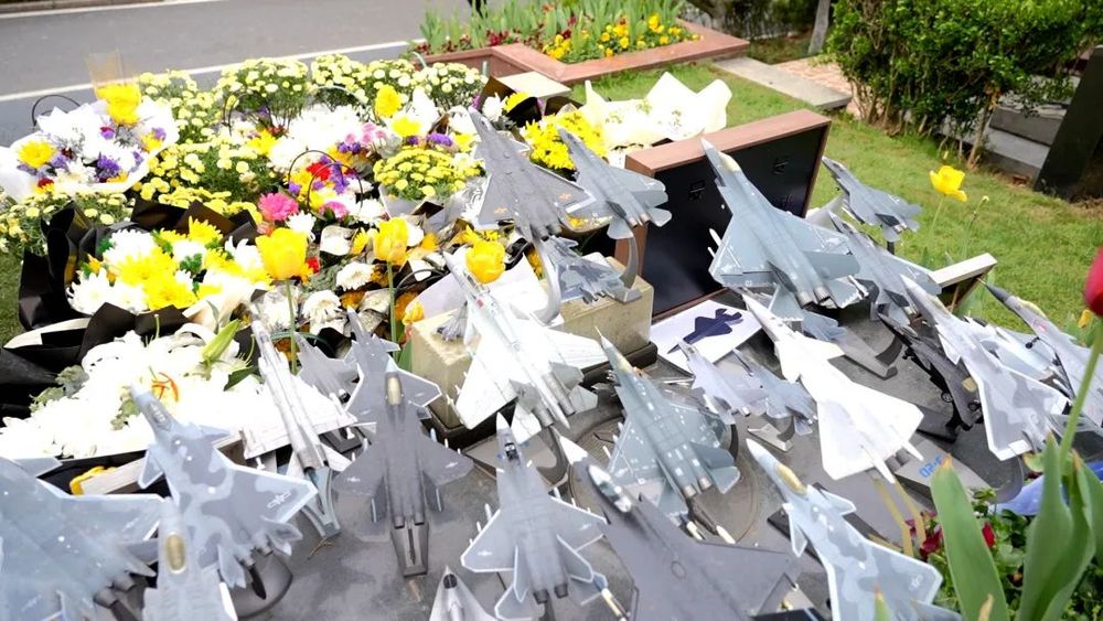 摆满了鲜花和战机模型