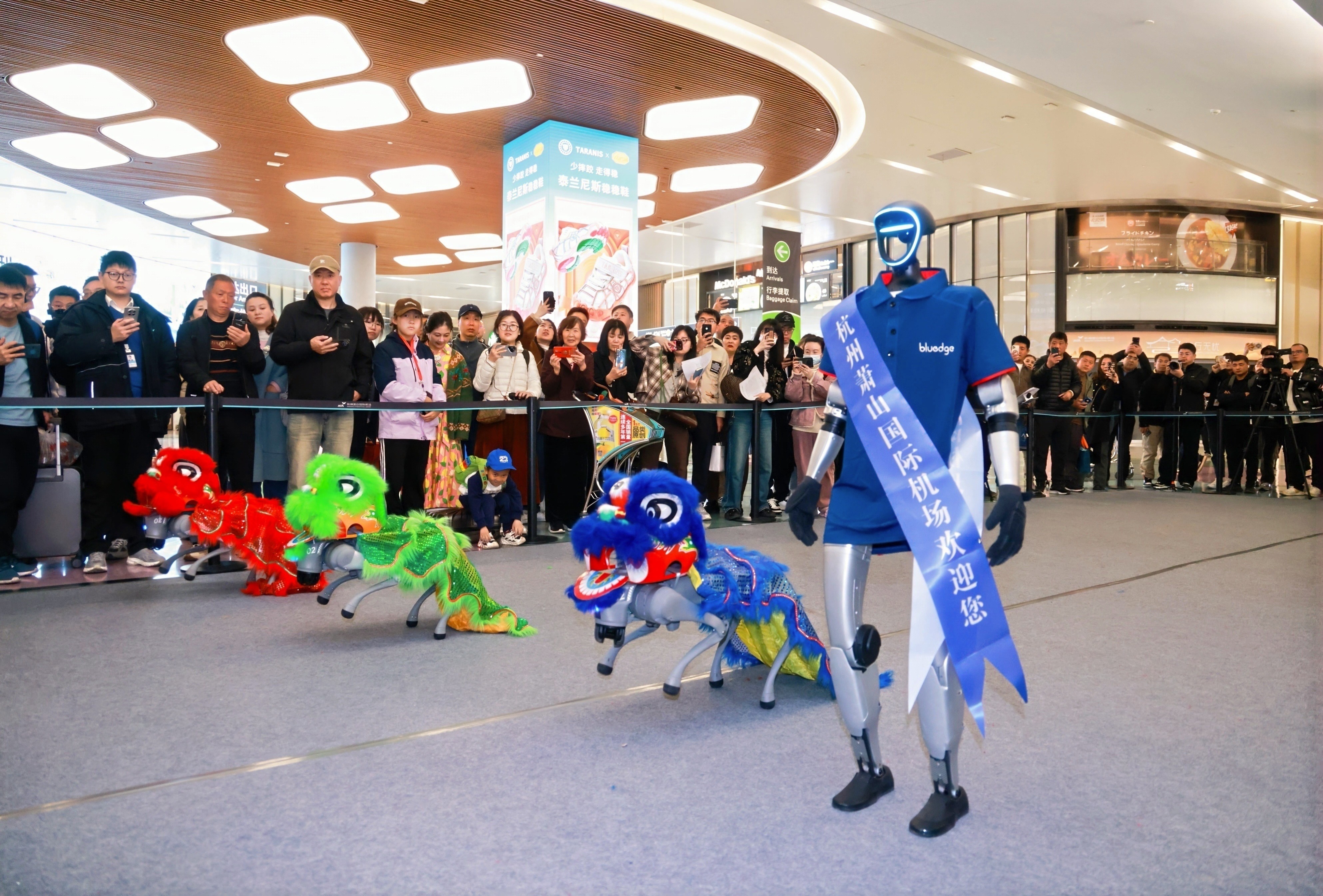 上午9时,T4国内出发安检后中庭响起舒缓的科技感音乐。宇树G1机器人稳步登台,在人群中自如穿梭,并与旅客友好握手,引得过往旅客纷纷驻足。现场一同亮相的还有数只扮成舞狮造型的宇树机器狗,伴随着激昂的锣鼓声,在舞台中央灵活完成“采青”“翻腾”等经典舞狮动作,将千年非遗文化与仿生科技完美融合,赢得旅客阵阵惊叹。