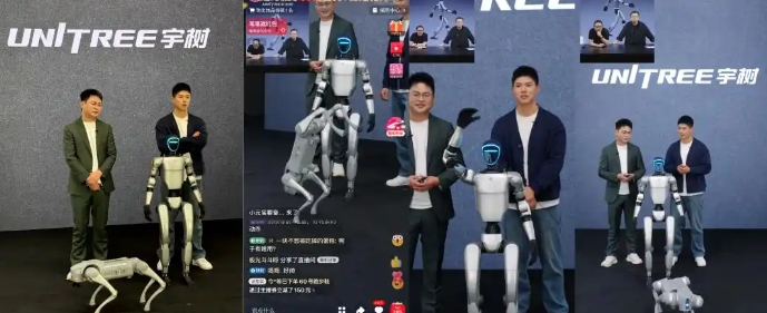 直播过程中,宇树机器人G1作为主播讲解商品,带货宇树科技GO2机器狗,售价9997元起。机器人讲品过程中,机器狗在一旁展示了握手、拜年、跳跃等动作。