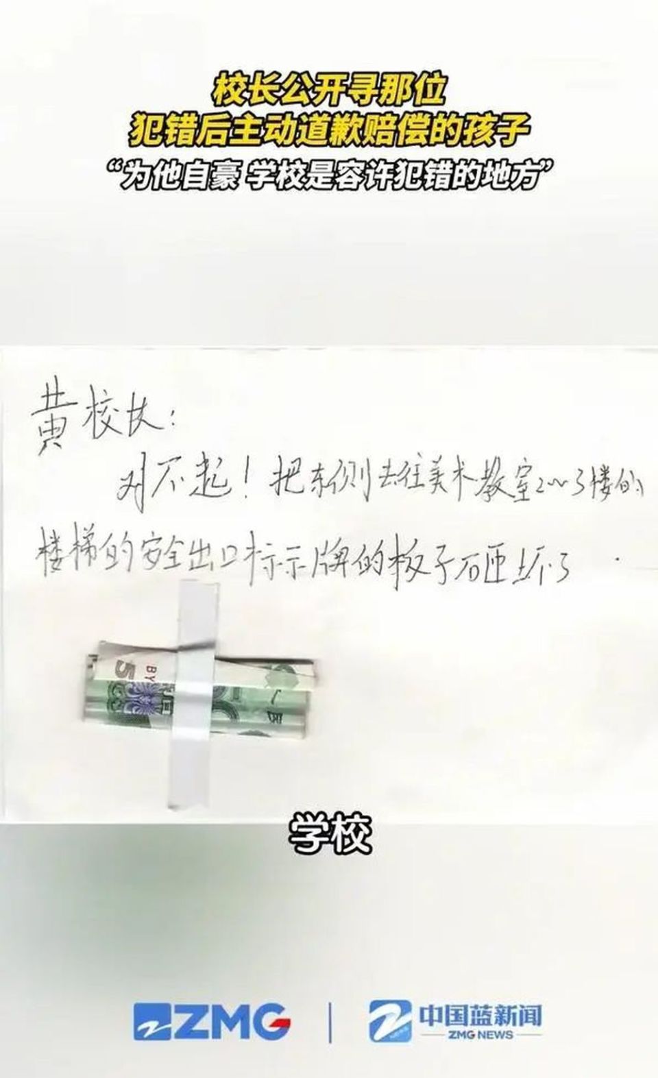 近日,杭州余杭一位校长在大会上公开寻找一名犯错后主动道歉赔偿的孩子。这个学生弄坏了楼梯的安全出口标示牌后,写了一封道歉信,还留下50元作为赔偿。校长没有责备他,也没有冷处理,而是当着全校师生的面请他上台,还说道,“为他感到自豪,学校是容许同学们犯错的地方”。