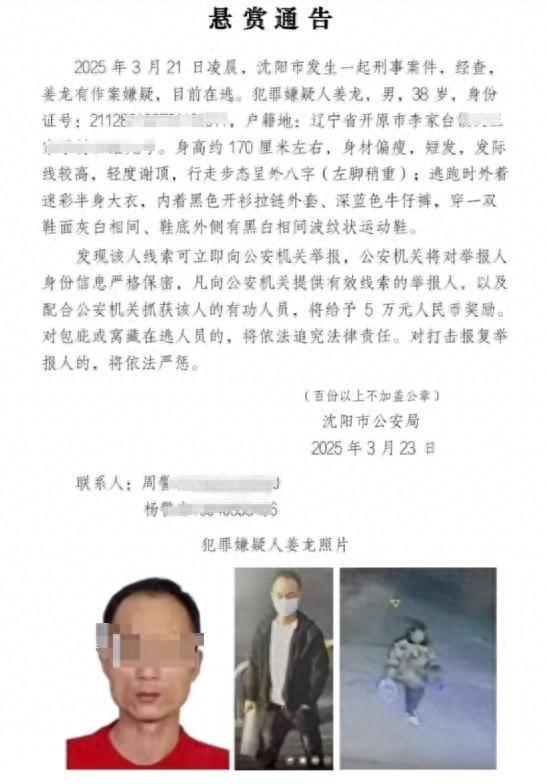 3月23日,沈阳市公安局曾发布悬赏通告,称3月21日凌晨,沈阳市发生一起刑事案件,经查,姜龙有作案嫌疑,目前在逃。4月2日,红星新闻记者从当地警方处了解到,犯罪嫌疑人姜龙目前已被抓获。