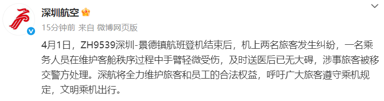 4月2日,深圳航空官方账号发文:4月1日,ZH9539深圳-景德镇航班登机结束后,机上两名旅客发生纠纷,一名乘务人员在维护客舱秩序过程中手臂轻微受伤,及时送医后已无大碍,涉事旅客被移交警方处理。深航将全力维护旅客和员工的合法权益,呼吁广大旅客遵守乘机规定,文明乘机出行。