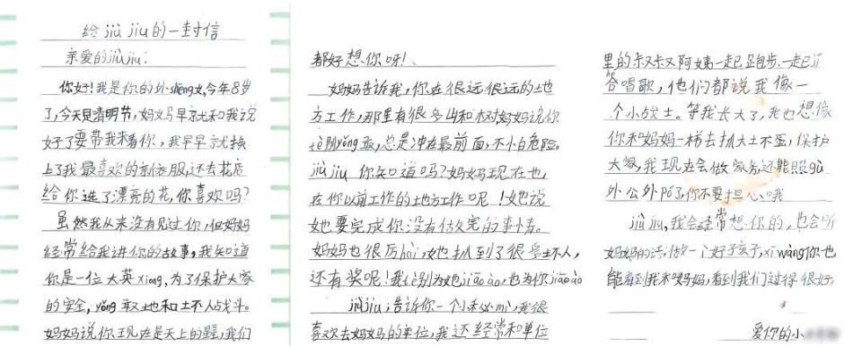 “亲爱的jiù jiu,你好。我是你的外shēng女,今年8岁了……虽然我从来没有见过你,但妈妈经常给我讲你的故事吗,我知道你是一位大英xióng。”