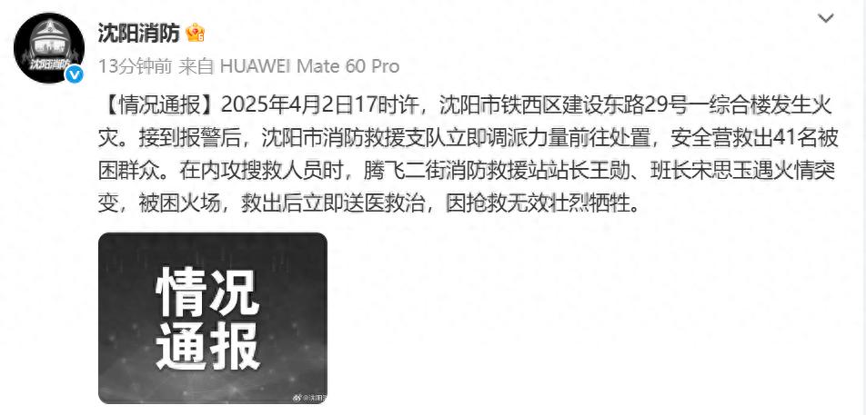 据沈阳市消防救援支队发布情况通报,2025年4月2日17时许,沈阳市铁西区建设东路29号一综合楼发生火灾。接到报警后,沈阳市消防救援支队立即调派力量前往处置,安全营救出41名被困群众。在内攻搜救人员时,腾飞二街消防救援站站长王勋、班长宋思玉遇火情突变,被困火场,救出后立即送医救治,因抢救无效壮烈牺牲。