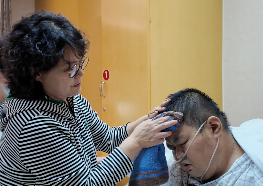 2025年1月6日,宇宙妈妈给刚刚从手术室出来的宇宙擦掉头上的汗。