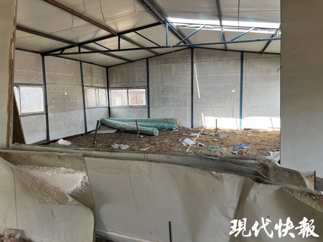 4月3日下午,现代快报记者来到这家农场,“和氏农场”的门楼仍在,电动伸缩门七倒八歪。门卫室已经人去楼空,室内一片狼藉。农场内土地荒芜,养牲畜的大棚门窗残缺,牛羊鸡不见踪影。