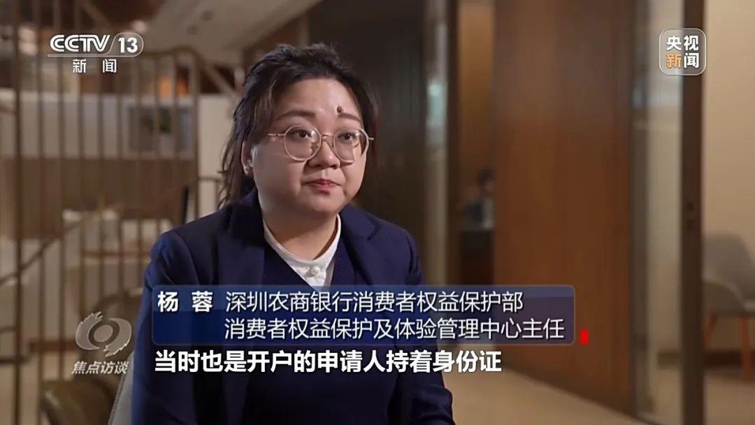深圳农商银行消费者权益保护部 消费者权益保护及体验管理中心主任 杨蓉:当时,开户申请人持身份证来到银行网点办理开户和申请数字证书业务,人脸识别设备没有通过的情况下,我们进行了人工审核,在人工审核的时候,我们会关注五官特征,包括耳朵在水平线的高度情况,特别是关注整个面部有没有关键的像痣、疤这些明显的特征来加以判断。当时根据现场比对,两个人相似度非常高,所以判断为像同一个人,就帮她办理了这项业务。