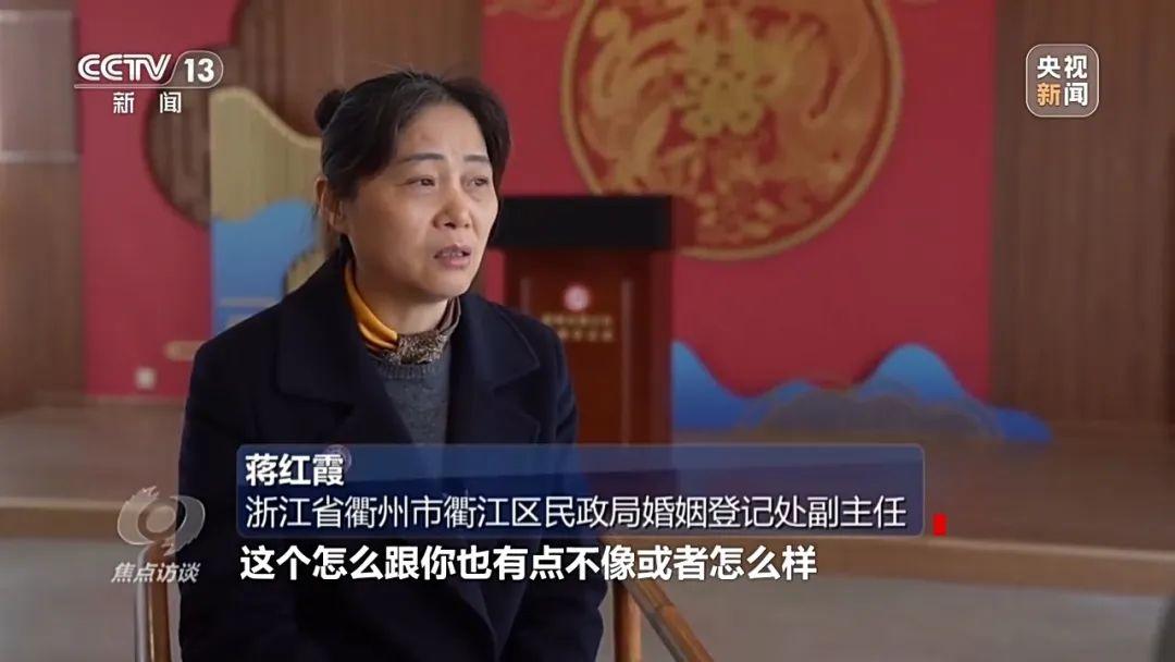 浙江省衢州市衢江区民政局婚姻登记处副主任蒋红霞:当时我们也询问来登记的人,这个怎么跟你有点不像,她说胖了瘦了或者怎么样了。因为不可能一直盯着人看,有些身份证拍出来跟本人确实有些不像,不是跟本人一模一样。身份证读卡能读出来,是真的身份证,一个真的身份证再去质疑它的有效性,就说不过去了,真实身份证拿来为什么不给办,有什么理由不给办?