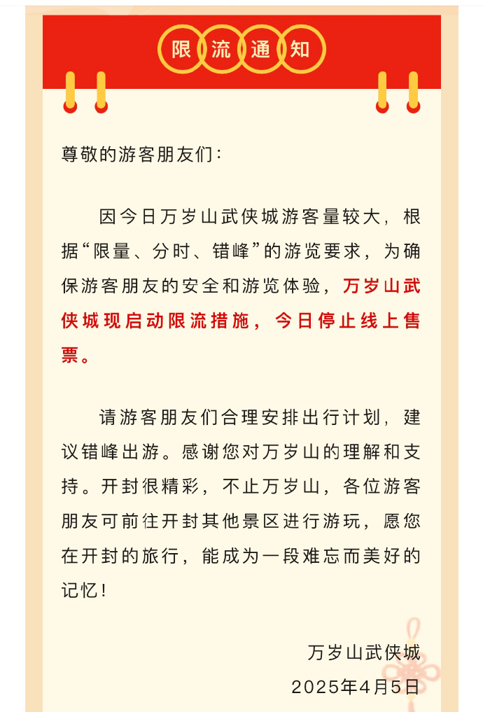 4月5日,大皖新闻记者联系了开封市文旅局,工作人员告诉记者,万岁山武侠城景区预约程序故障可能是因为游客太多了,预约太多所以崩了,目前景区目前已采取限流措施。该值班工作人员建议,游客可以避开游玩高峰期。