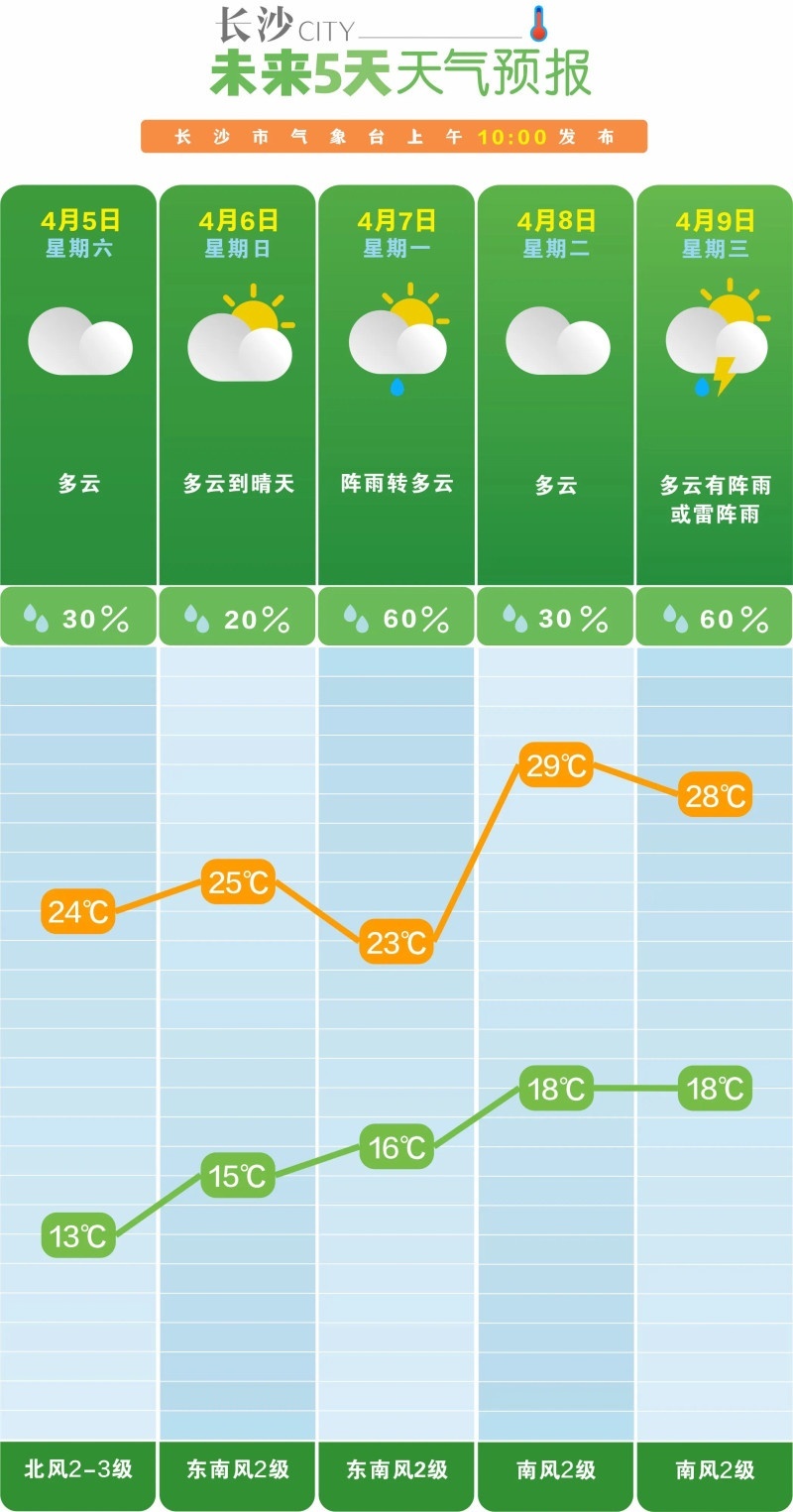 虽然清明假期以雨水开场,但好在持续时间不长,雨量不大,明后两天天气逐渐转晴。根据长沙市气象台最新发布的天气预报,5日到6日,长沙以多云或晴天为主,其中5日长沙多云,气温13℃至24℃;7日白天,长沙多云有阵雨;7日晚到8日,长沙多云为主,最高气温将达到29℃;9日到11日,受高空波动影响,长沙多阵性降雨。