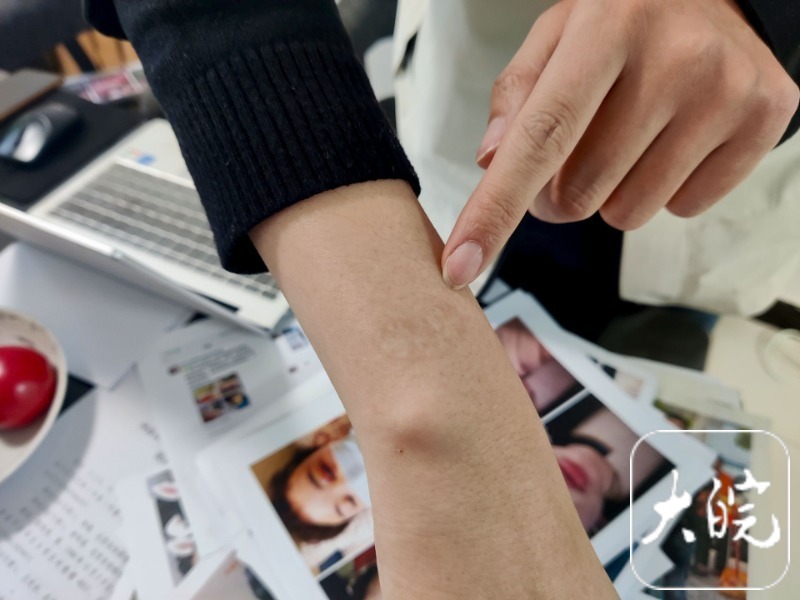 李萍称,其手腕处被烟头烫伤留下伤疤。