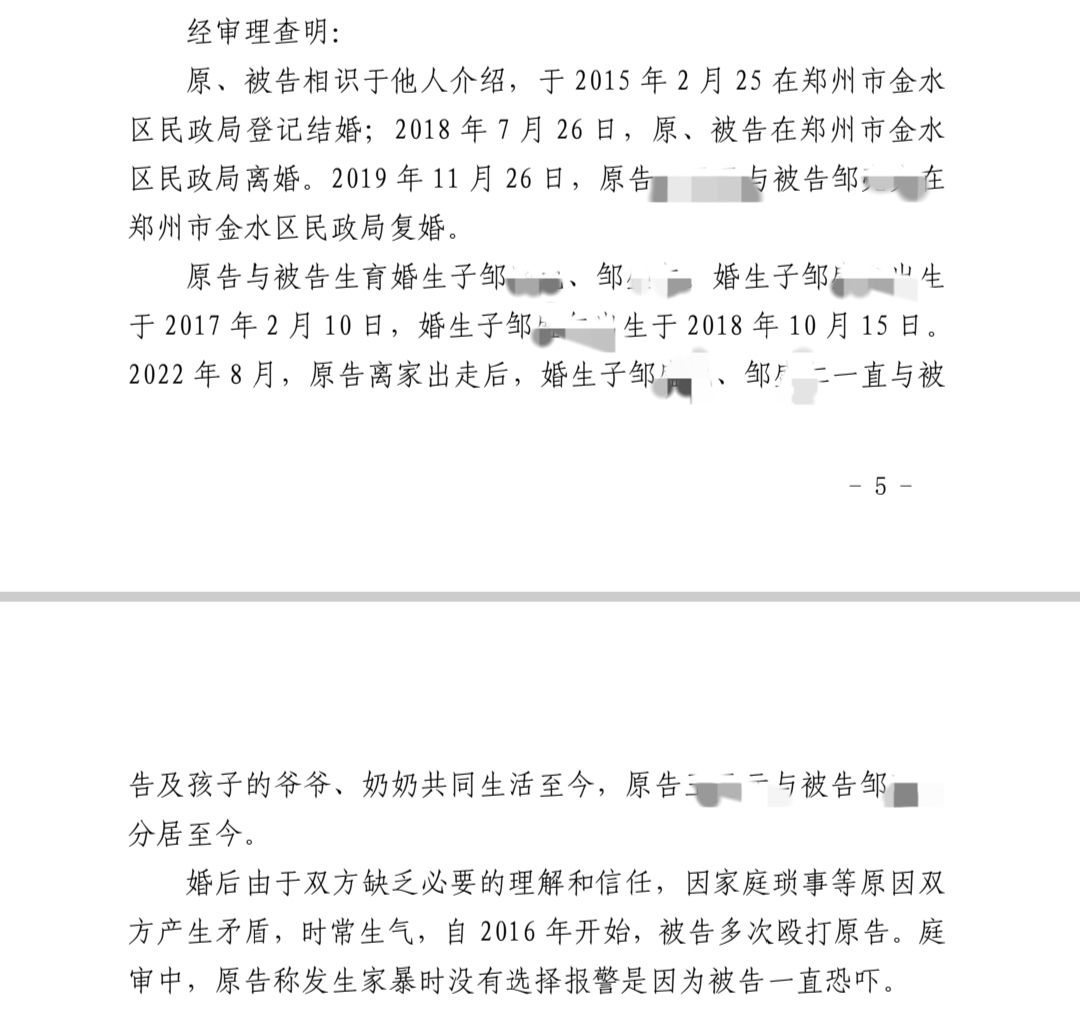 2023年8月3日,郑州市金水区人民法院民事判决书显示,原告李萍称婚后遭遇丈夫家暴,给其生理和心理造成严重的伤害,请求判令双方离婚,两个儿子由原告抚养,并让被告支付原告遭受家暴导致的精神损失费。被告邹某辩称同意离婚,但没有家暴,不应当支付精神损失费,两个孩子也应由被告抚养。