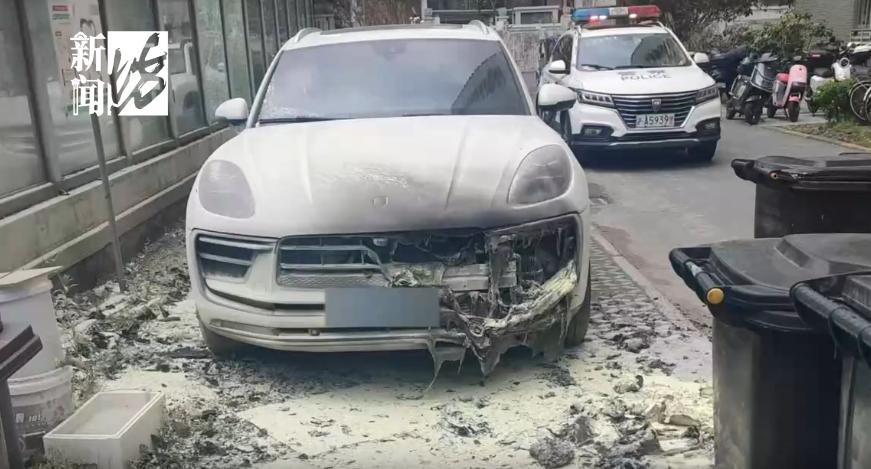 虽然未造成人员伤亡,但停在垃圾桶边上的一辆保时捷却遭了殃,车头被烧毁了。
