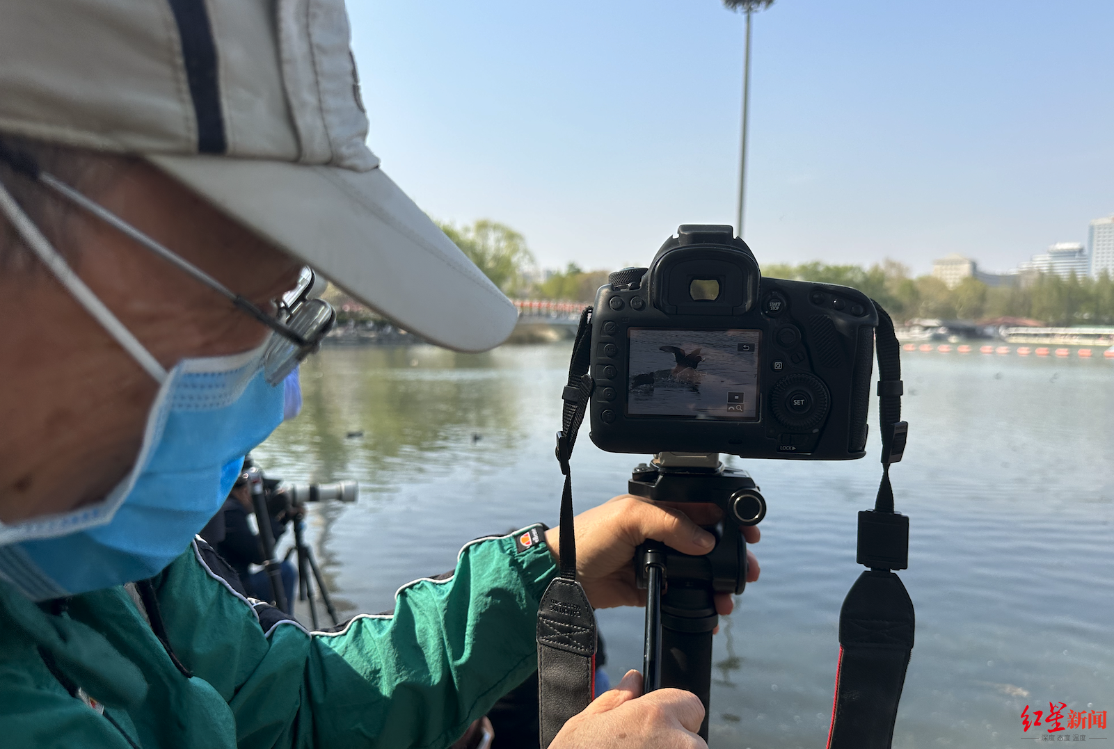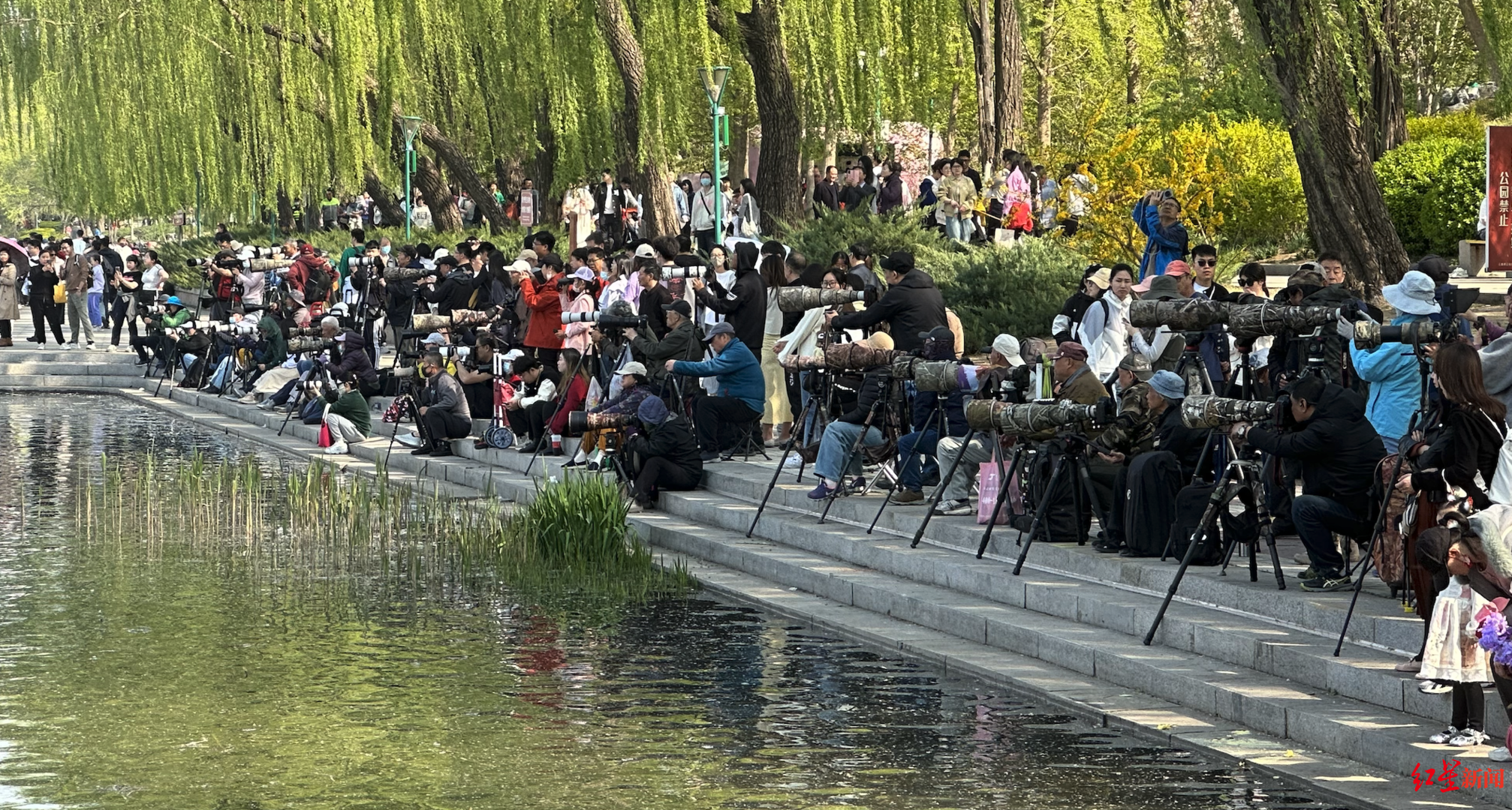 公园保安告诉红星新闻记者,拍鸟的人从早上六点到晚上六点多不间断,这几天假期游客太多,摄影师比平时还少了一些。