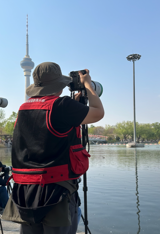 由于正值清明假期和樱花季,公园内人头攒动十分热闹,但在玉渊潭西南侧湖边则显得十分安静,近百位摄影师手持专业的长焦镜头对着湖面上的鸟拍摄。记者在现场看到,摄影师多为年龄较大的男性,有些已经头发花白,他们坐在湖边观察鸟类互动,发现好的画面会立刻开启连拍,并相互交流照片。