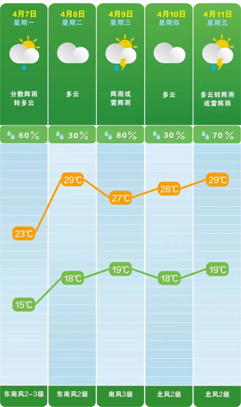 那长沙是不是接下来几天气温也将达到30℃呢?根据长沙市气象台发布的最新天气预报,7日长沙分散阵雨转多云,气温15℃至23℃;7日到8日,环流平直,多云为主,有分散阵雨,最高气温升至29℃;9日到11日,高空波动配合低层切变影响,长沙多阵雨或雷阵雨,局地伴有雷暴大风等强对流天气;12日到13日,长沙多云或晴天。