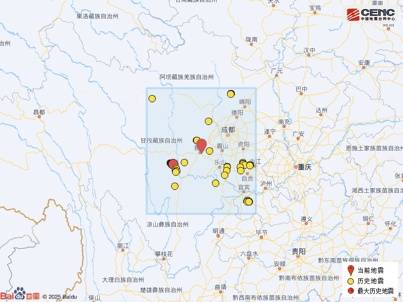 历史地震:根据中国地震台网速报目录,震中周边200公里内近5年来发生3级以上地震共180次,最大地震是2022年9月5日在四川甘孜州泸定县发生的6.8级地震(距离本次震中113公里),按震级大小前50次历史地震分布如图。