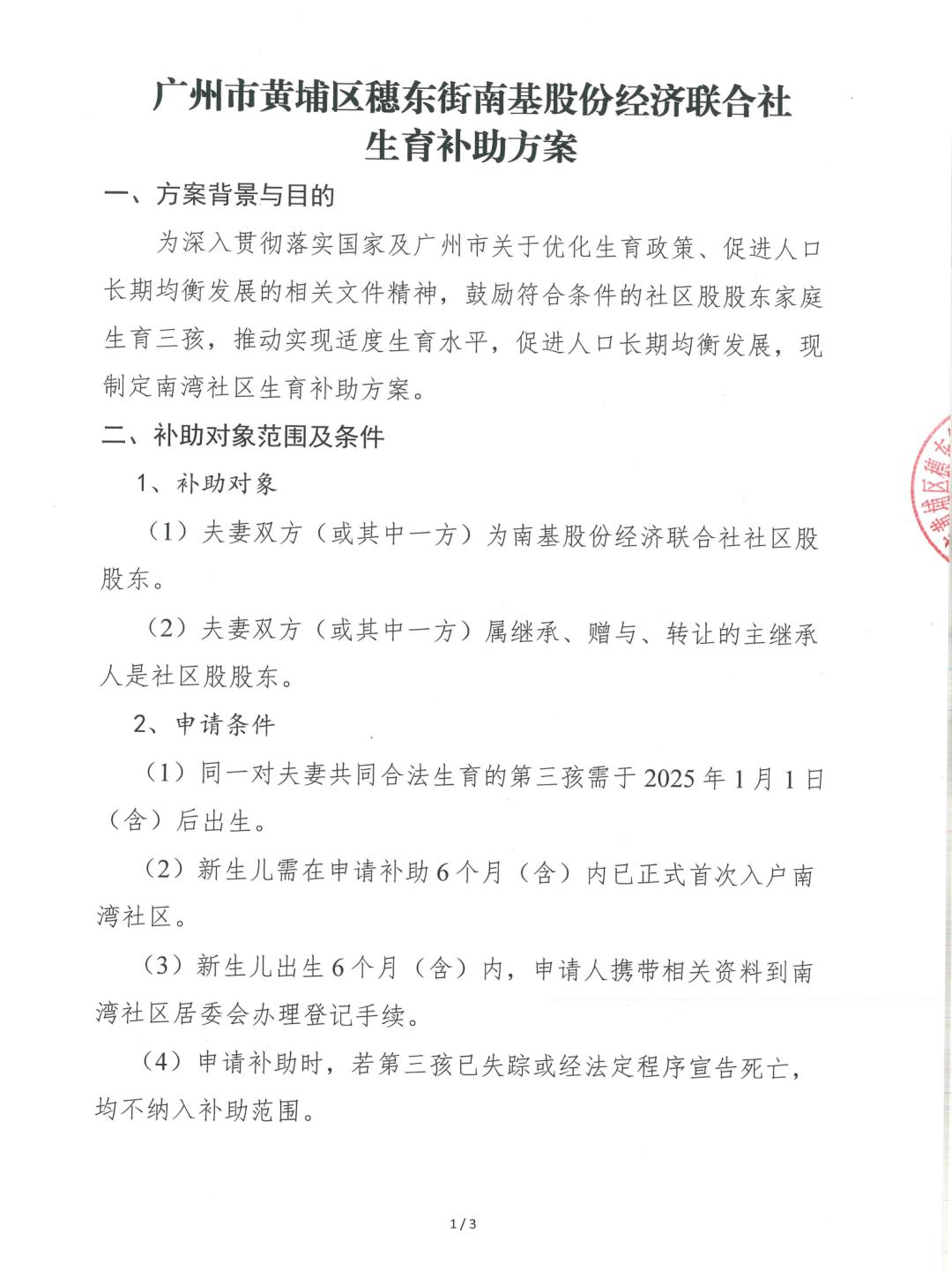 根据方案,夫妻双方(或其中一方)为社区股股东,或属继承、赠予、转让的主继承人是社区股股东,则符合补助对象要求。同一对夫妇共同生育合法的第三孩在2025年1月1日(含)后出生,就可以办理申请了。符合条件者,可联系南湾社区公服站办理生育补助手续。