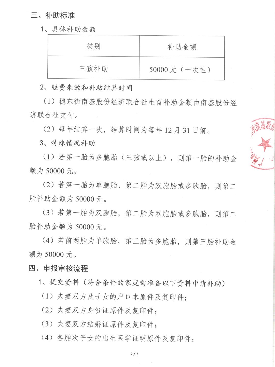近日,广州市黄埔区南湾社区召开党员大会和南基股份经济联合社股东代表大会,审议通过《广州市黄埔区穗东街南基股份经济联合社生育补助方案》,明确规定符合条件的家庭生育三孩可一次性申领50000元生育补助金。