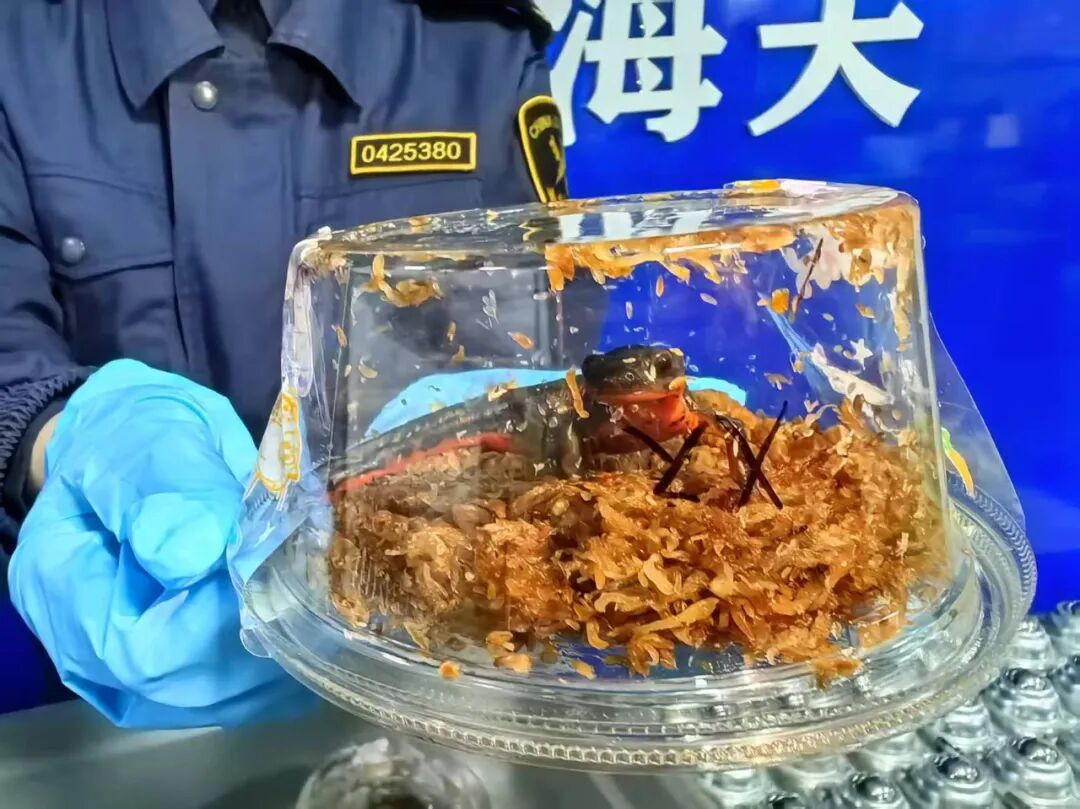石家庄机场海关在对一票申报为“杯子”的邮件进行监管时,通过智能审图系统发现图像异常。综合研判,高度怀疑其内容物疑似活体动物,随即进行开箱查验。经现场关员检查,发现该邮件内装有13个密封塑料盒,盒内装有活体蝾螈共计49只。经送石家庄海关技术中心进行物种鉴定,确认该批蝾螈为剑尾蝾螈,在我国无自然分布,属外来物种。剑尾蝾螈是两栖纲动物,体表呈黑色或深褐色,腹部为橙红色,尾部侧扁且较长,形状宛如一柄长剑,如传入将对我国生态安全和生物安全造成潜在威胁。