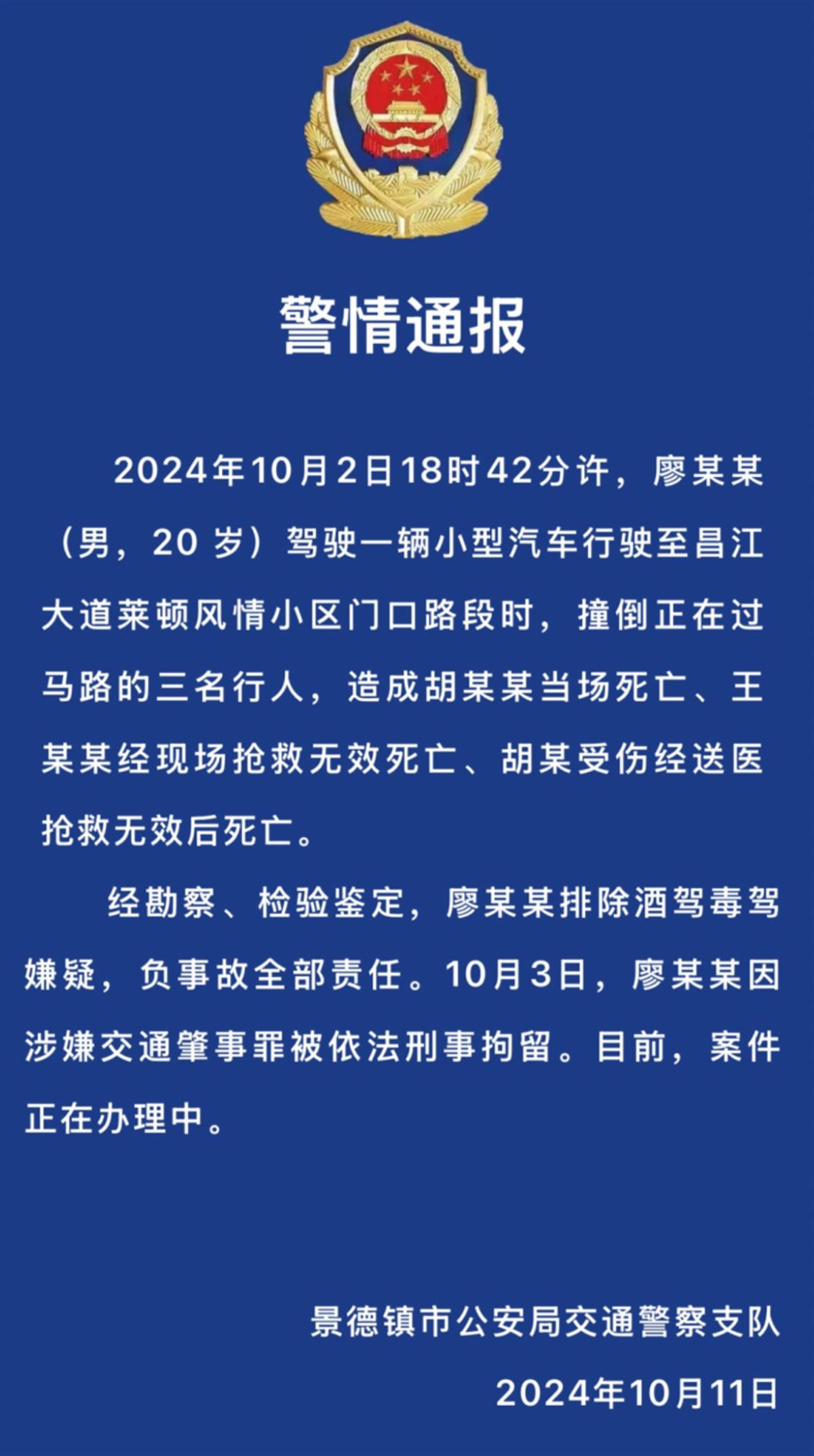 此前,警方通报廖某某因涉嫌交通肇事罪被依法刑事拘留,而后,廖某某因涉嫌以危险方法危害公共安全罪被检察院批准逮捕。