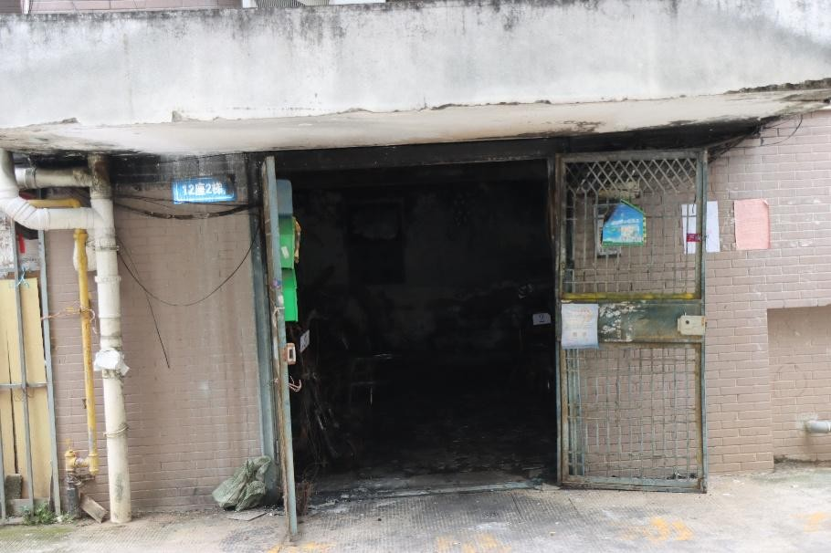 事故现场西庄小区12号楼2梯一层门厅全部过火,门厅内电动自行车、配电箱、弱电箱和堆放的杂物烧毁,墙面呈洁净燃烧痕迹;一层楼梯间内烟熏痕迹重,自行车和杂物表面有高温烘烤熔融变形痕迹。二层以上楼层未过火,但有烟熏痕迹,且楼层越高,烟熏痕迹越淡;二至五层楼梯间吸顶灯掉落,六层和七层吸顶灯完好;二层103和104入户门局部因高温烘烤变形,三层以上各入户门及门锁完好。