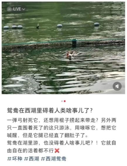 4月7日,有网友发文,称在杭州西湖景区,有游客用弹弓打死了水面的一只鸳鸯。