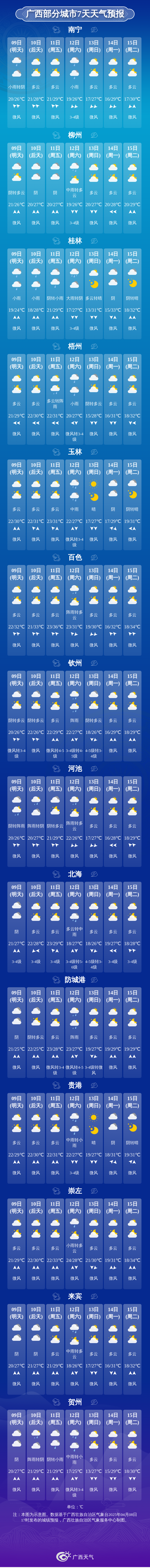 9日晚上到10日白天,桂北部分地区阴天有阵雨或雷雨、局地中雨,其它地区多云有分散阵雨。